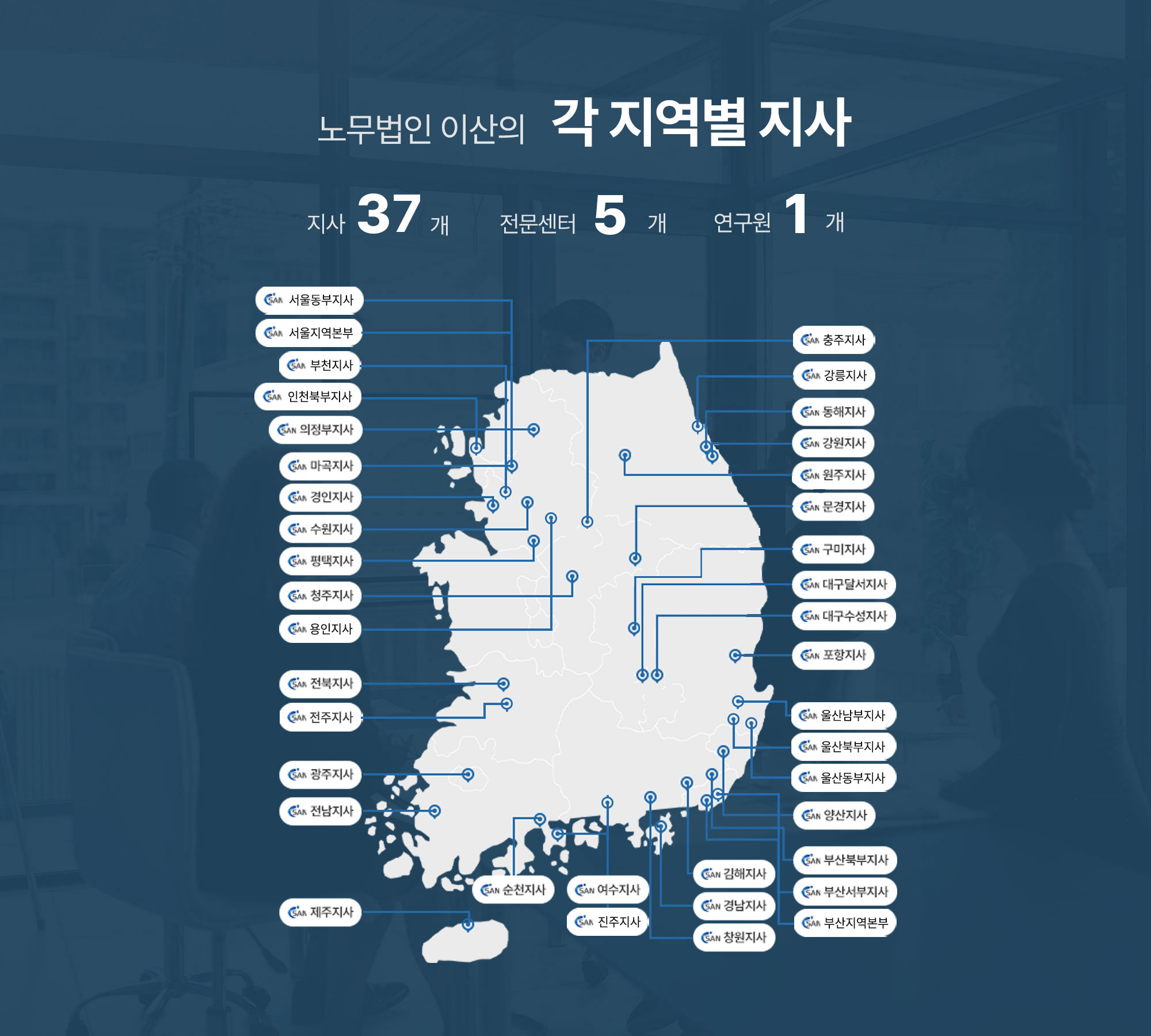 전국 36개 지사와 5개 전문센터의 노동법률 전문가들이 인사노무 전반의 이슈에 대하여 고객사와 고객이 필요로하는 최적의 서비스를 제공합니다.